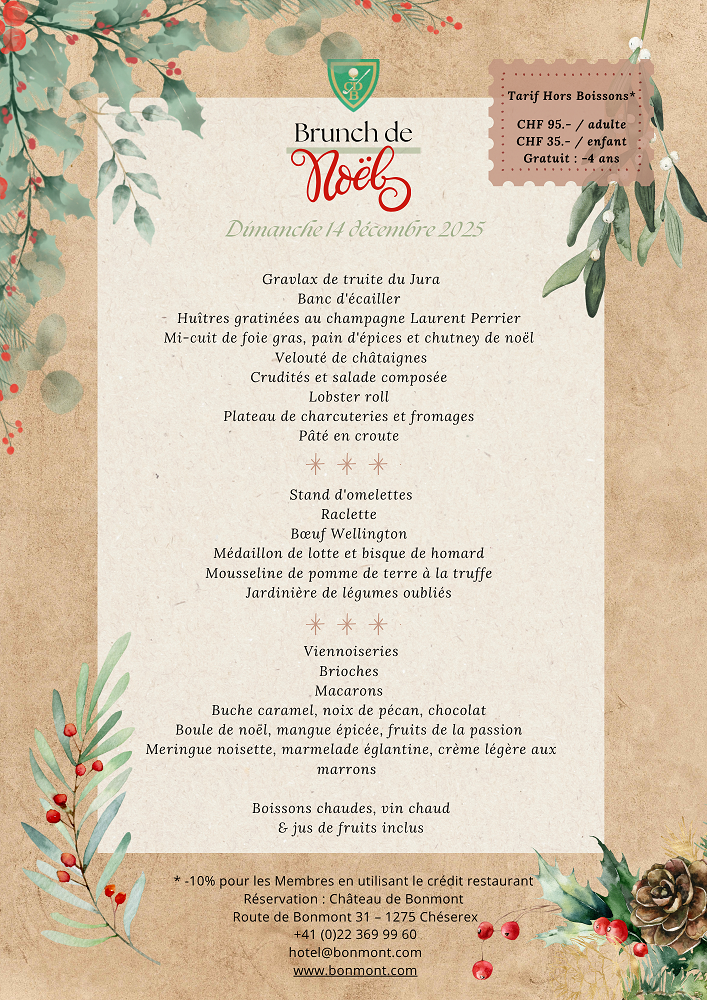 Le Château de Bonmont vous propose de vivre la magie de Noël, le dimanche 14.12.2025 dès 11h30 avec un brunch qui combine gourmandise, ambiance festive et moments de partage.