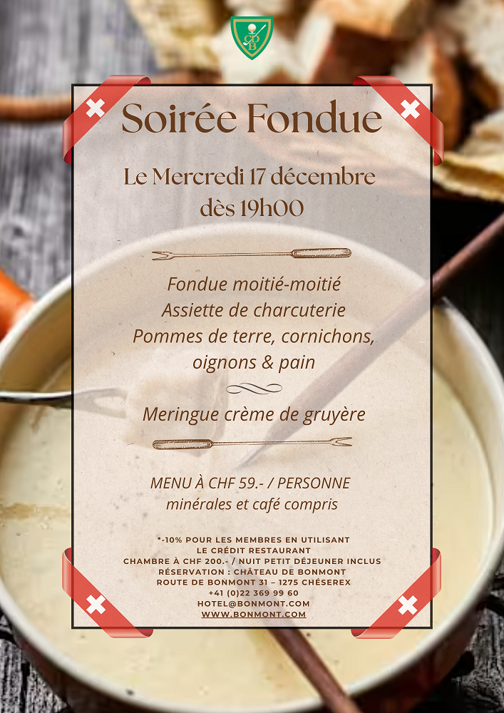 Le Château de Bonmont vous propose de régaler vos papilles autour d’une fondue moitié-moitié, le mercredi 17 décembre 2025b dès 19h00, dans une ambiance chaleureuse et conviviale.